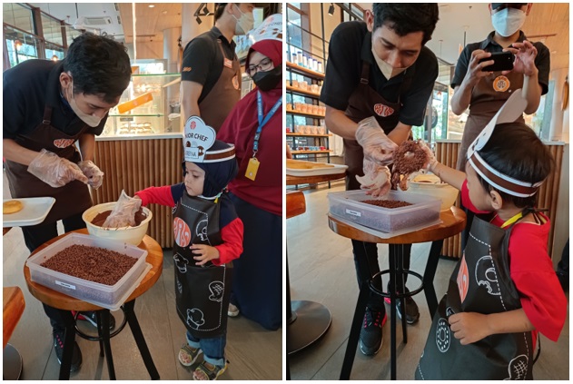 Kemudian anak-anak diminta untuk mengambil adonan donat yang sudah jadi dan sudah digoreng untuk dihias diberi rasa dan toping, kali ini sebelum menghias donat kakak-kakak dari tim J.CO mengenalkan berbagai macam warna coklat dan toping yang akan digunakan, ada rasa Coklat oroginal, White coklat, Strawbery Coklat, dan rasa Greentea dengan berbagai macam toping tentunya, ada toping mesis coklat dan mesis warna warni, chocochips, dan kacang almond. Disini anak-anak diperbolehkan untuk memegang langsung jenis coklat dan toping tersebut untuk mengenal berbagai tekstur dari coklat dan toping itu sendiri.