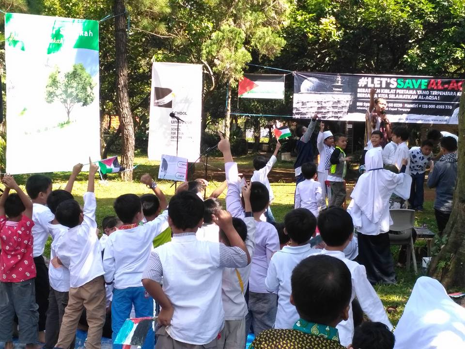 Bekerja sama dengan Aksi Cepat Tanggap (ACT), Seluruh dana yang terhimpun dari orang tua, siswa-siswi dan guru serta staf School of Universe sebesar Rp. 24.029.100,- segera disalurkan kepada yang membutuhkan. Acara di isi dongeng untuk anak tentang keadaan rakyat Palestine oleh tim dari ACT, kreatifitas siswa dan ditutup dengan do'a bersama.