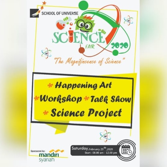 Jangan lupa tanggal 29 Februari 2020 Science fair kembali digelar ya. Jangan lupa untuk datang karena banyak hal menarik yang akan ditampilkan. Tentu saja, selain hasil project siswa-siswi School of Universe mulai dari TK hingga SM, acara juga akan dimeriahkan dengan happening art, workshop dan talk show. Ada yang special lho di Science fair kali ini yang melibatkan semua baik siswa-siswi, ataupun semua yang hadir. Penasarankan? jadi catat tanggalnya dan sampai jumpa di SOU :)