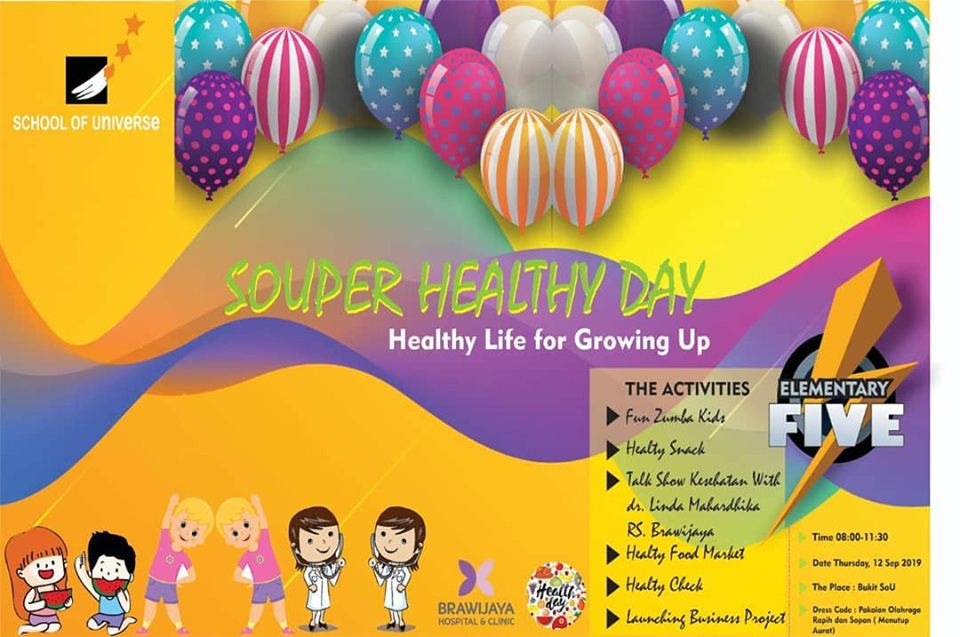 Ada kegiatan yang seru dari SD 5 bertajuk 'SOUper Healthy Day E-Five - healthy life for growing Up'. Dalam rangka pengumpulan dana untuk kegiatan Ekspedisi, siswa-siswi SD 5 bersama ayah bunda dan fasilitator menjalankan event ini. Event yang diadakan pada hari kamis, 12 September 2019 tidak hanya menggelar kampanye hidup sehat saja, tetapi banyak kegiatan-kegiatan lain yang sangat seru. Ada senam irama kolosal yang akan di instrukturi oleh salah seorang siswa, cek kesehatan gratis bahkan ada talkshow kesehatan bersama Dr. Linda Mahardhika dari Brawijaya Hospital.