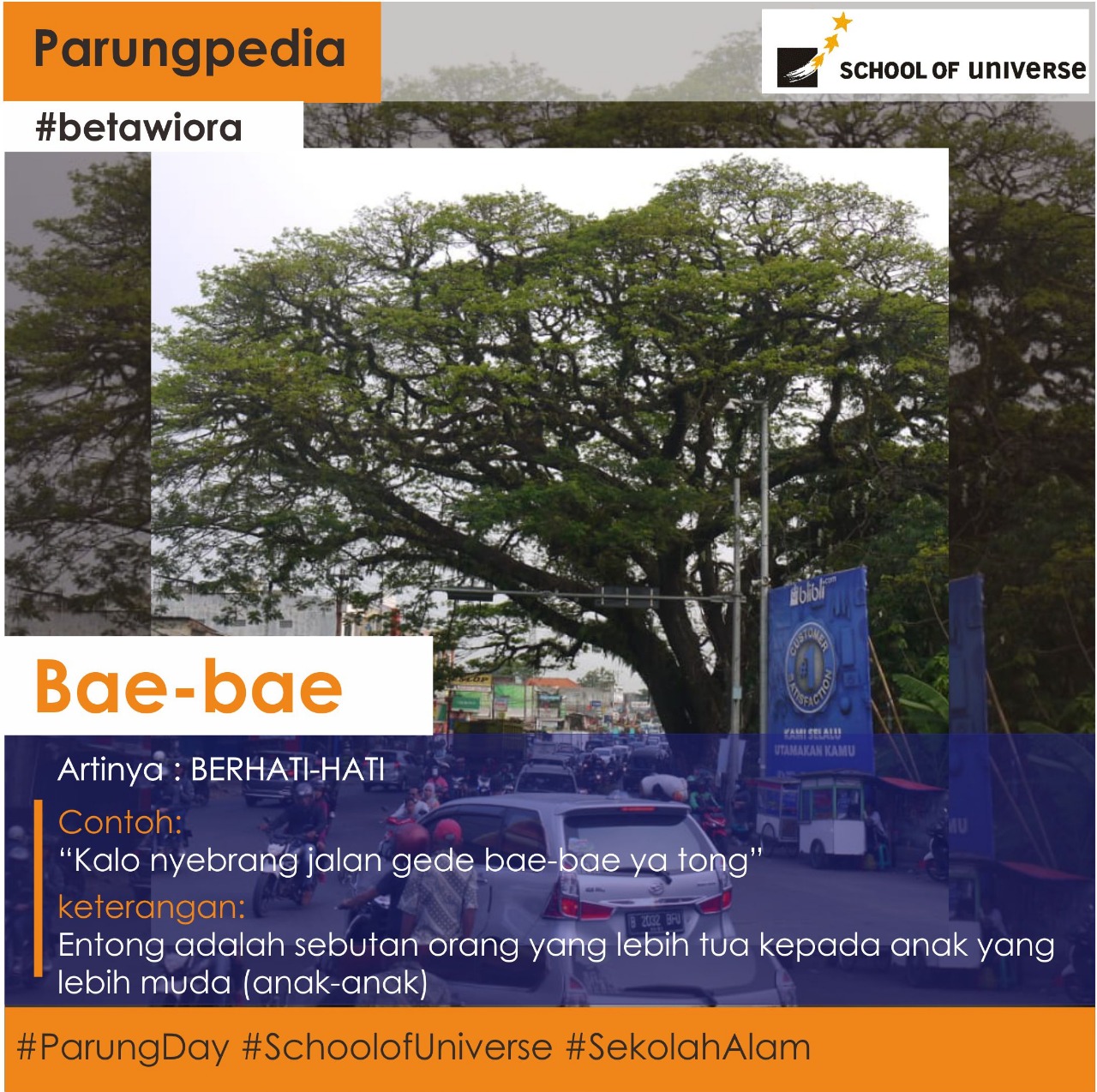 Penutup tahun ajaran 2020-2021, Sekolah Alam School of Universe memilih budaya Parung. Setelah pada tahun-tahun sebelumnya culture day memilih beragam budaya nusantara, seperti Betawi Day, Minang Day, Papua Day, Maluku Day, dan banyak lainnya, kali ini dipilih budaya lokal daerah Parung di mana School of Universe berada. Pemilihan budaya Parung bukan tanpa alasan. Dengan adanya pandemi covid-19, kita memberi makna bahwa dengan berada di 'rumah' kita akan lebih aman. Namun tanpa melihat kondisi pandemi saat ini, Parung adalah salah satu daerah yang berada di wilayah Kabupaten Bogor dengan kekayaan budaya yang melimpah. Nuansa peleburan budaya Betawi dan Sunda terjadi di daerah ini. Banyak orang menyebut Betawi Ora. Tentunya Budaya Parung jarang kita lihat dan ter ekspos tayangannya di media cetak maupun televisi. Dengan Parung Day kali ini, diharapkan Budaya Parung dapat lebih dikenal masyarakat luas, termasuk kekayaan kuliner, wisata, dan bisnisnya, serta potensi lokal lainnya.