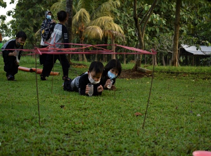 Nahhh setelah tracking teman-teman diminta untuk istirahat, shalat dzuhur dan makan siang, selesai ishoma teman-teman melanjutkan kegiatannya, yaitu outbound kali ini outboundnya adalah two line bridge dan landing net. Di sini teman-teman dilatih keberanian dan konsentrasinya.