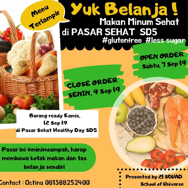 Kampanye hidup sehat dengan olah raga teratur, cukup tidur, pikiran yang happy dan yang pasti makan dan minum sehat. Mari dukung pengumpulan dana SD 5 dengan memesan makanan dan minuman sehat yang akan dijual pada saat acara. Bisa pre order juga lho, dengan memanfaatkan sosmed, ayah bunda bisa memesan makanan dan minuman yang bisa dikonsumsi saat acara atau di bawa pulang. Nasi Bakar merah, Nasi pecel, bumbu urab, bakso kuah home made, dimsum, jamu kunyit asam, beras kencur, jus buah dan banyak snack sehat lainnya. silahkan whatsapp ke link berikut wa.me/6281388252400