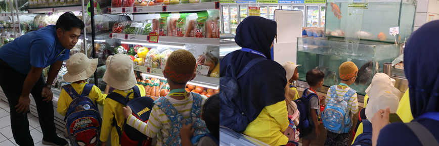 “nah anak-anak di Hyfresh itu selain menyediakan sayur dan buah-buah segar di sini juga menyediakan ikan dan daging yang segar tentunya, niiih lihat niihh ikannya masih hidupkan...?,” ujar pak Tino sambil menunjuk ikan yang ada didalam aquarium besar, ini namanya ikan apa hayoo siapa yang tau, lanjut pak Tino, ikan gurame !!! sahut salah satu anak, iya betul ini ikan gurame jawab pak Tino sambil bertepuk tangan...