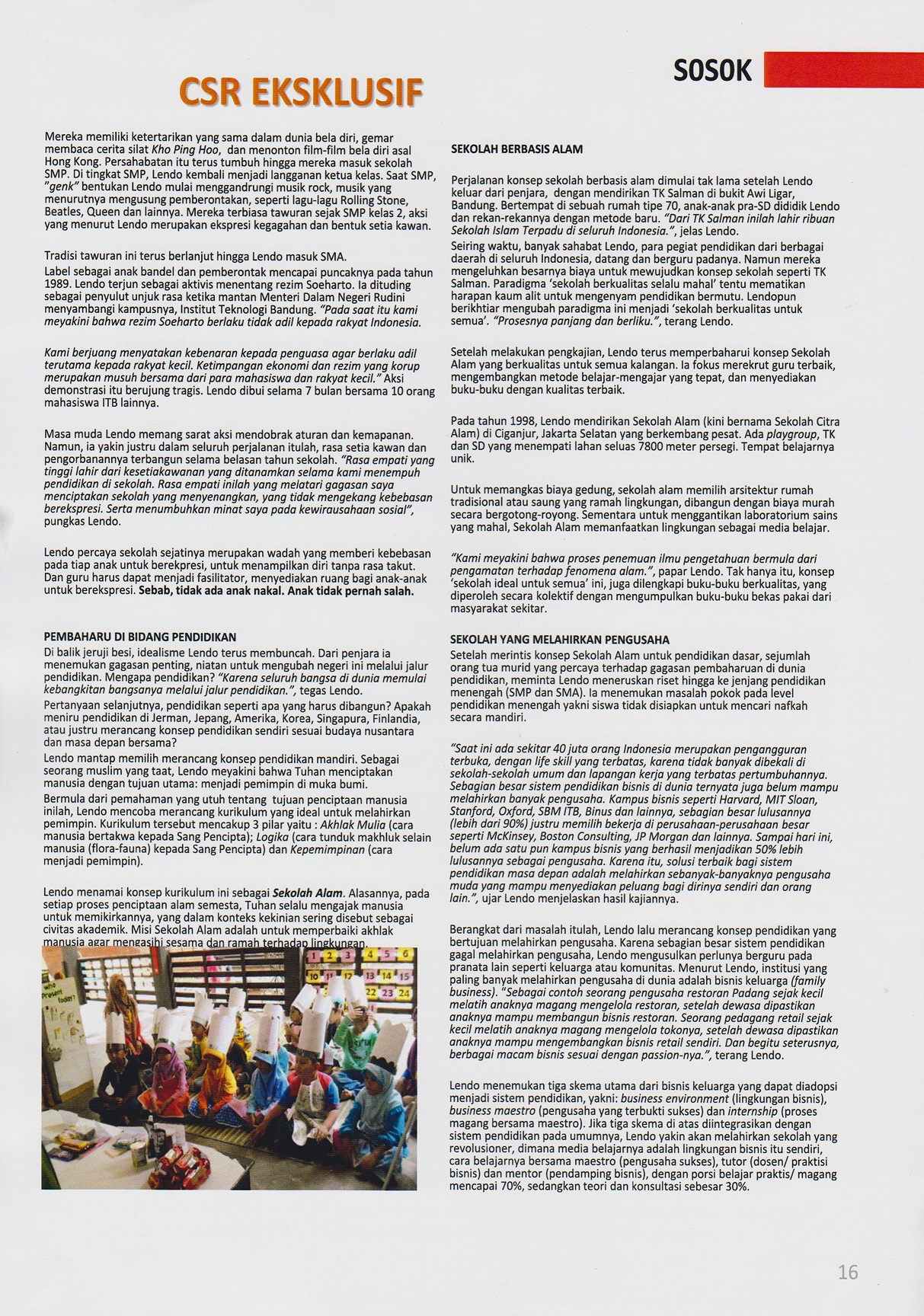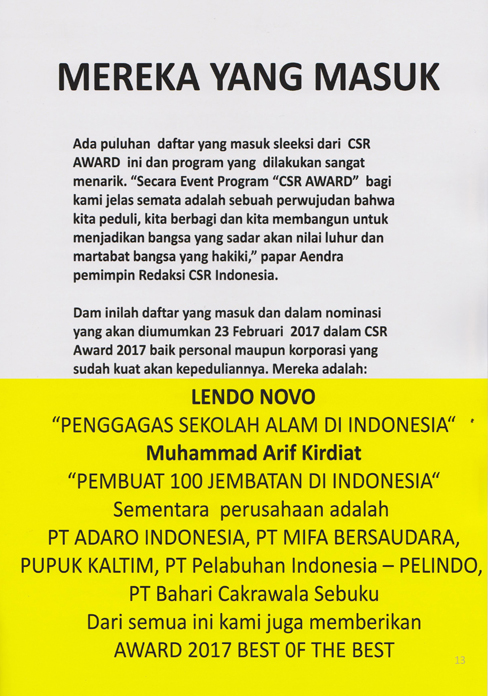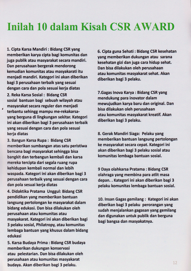 CSR Indonesia banyak meneliti dan melakukan kajian serta menulis tentang CSR secara rutin dan terpadu. Dalam ajang "CSR Award & Summit 2017" sebuah event dan penghargaan tertinggi di Indonesia ada 10 bidang aktif dalam program CSR yang menjadi unggulan. Selamat bagi para pemenang CSR AWARD tahun ini.