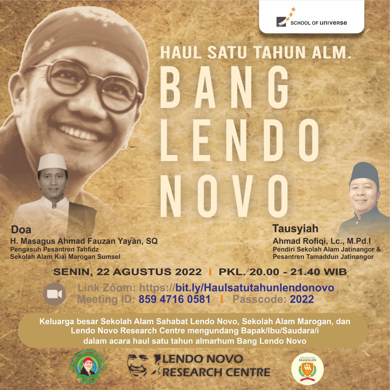 Dengan memanjatkan doa dan ridha Allah SWT, keluarga besar Sekolah Alam Sahabat Lendo Novo dan Lendo Novo Research Centre bermaksud mengundang Bapak/Ibu/Saudara/i dalam acara *Do'a Bersama 1 Tahun Berpulangnya* Ayahanda/Adik/Paman/Sahabat, *Allaahu yarham Bang Lendo Novo* secara virtual (Zoom).