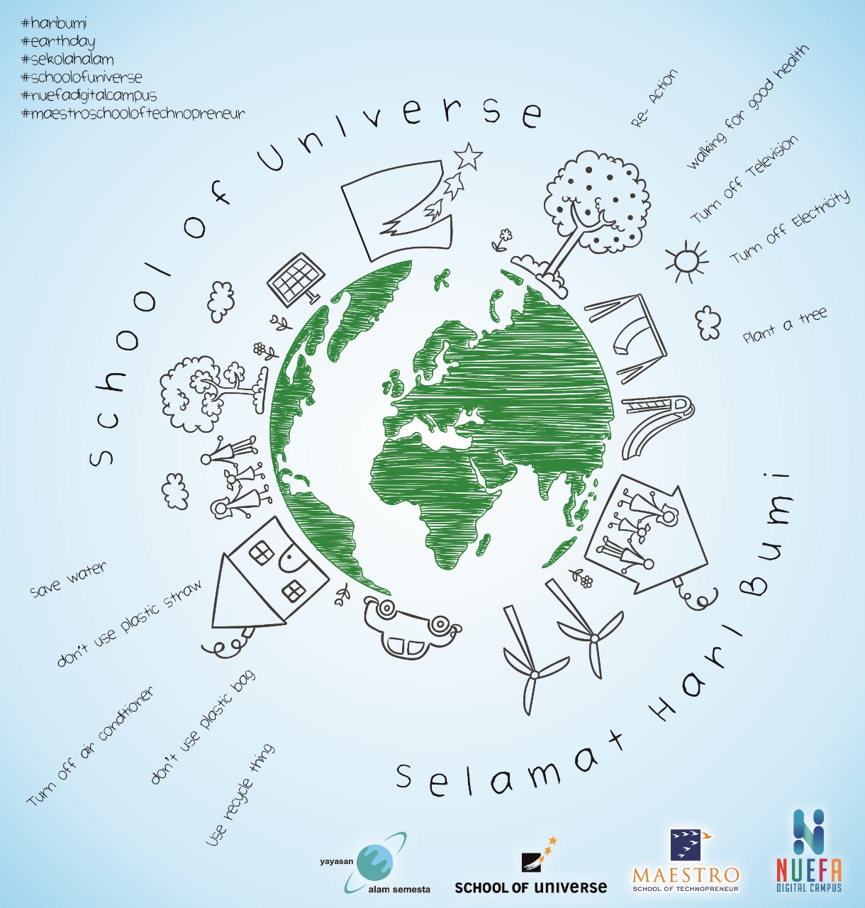 Tidak ketinggalan, sekolah-sekolah pun turut memperingati Hari Bumi dengan kegiatan tersebut, termasuk Sekolah Alam School of Universe. Namun kali ini karena Kegiatan Belajar Mengajar berlangsung dari rumah maka kegiatan-kegiatan peringatan hari bumipun dilakukan ananda bersama keluarga di rumah masing-masing.