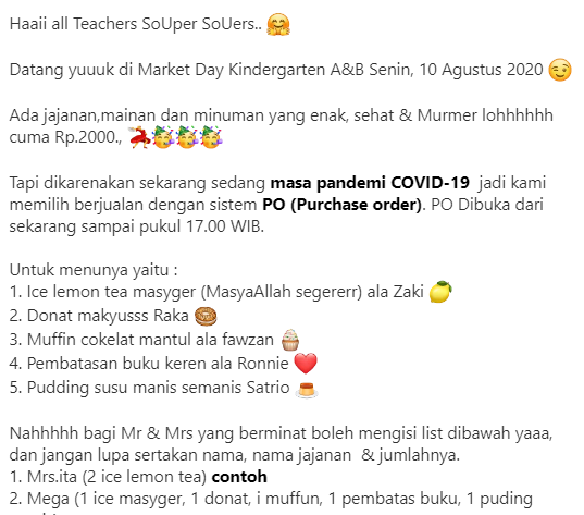 Senin, 10 Agustus TK School of Universe melakukan kegiatan Market Day dimana kali ini Sistem penjualan kami berupa Pre Order (PO). Siswa diajak untuk membuat sebuah produk di rumah bersama orangtua untuk kemudian di jual kepada civitas School of Universe atau sekitar lingkungan rumah. Alhamdulilah banyak  pesanan kami pun bergembira namun tidak hanya itu kegiatan market day kali ini tidak hanya menjual produk makanan tapi bisa di lakukan juga di rumah dengan membantu Ayah atau Bunda.